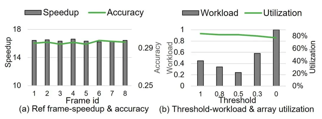 如图9(b)所示,我们分析了不同分配阈值对处理单元数组负载和利用率的影响。结果表明,当阈值设为50%时,可以实现最低的负载和最高的硬件利用率。