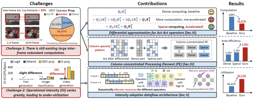如何有效地加速视频生成模型的推理过程,不仅对模型性能的优化提出了更高的要求,也成为推动生成技术落地的重要瓶颈问题。这一背景下,针对特定生成任务设计高效的计算架构和优化算法成为当前的研究重点。以OpenAI的Sora为代表,视频扩散Transformer(VDiT)模型的最新进展极大地推动了视频生成领域的发展。然而,VDiT推理过程中仍然存在帧间计算冗余和算子计算强度差异较大的问题。现有基于有限帧间相似性的计算方法以及静态硬件架构和数据流设计,无法有效解决VDiT推理速度缓慢的瓶颈。为应对上述挑战,作者团队结合帧间预测的差分计算与帧内稀疏特性的分析,提出了视频生成模型的软硬一体加速器ViDA,创造性地通过差分近似方法和自适应数据流架构,利用稀疏性实现软硬件协同优化,从而大幅提升了VDiT的推理性能。在多种主流VDiT模型上的实验结果表明,与NVIDIA A100 GPU和现有最先进加速器相比,ViDA分别实现了平均16.44倍/2.18倍的加速比和18.39倍/2.35倍的面积效率提升。