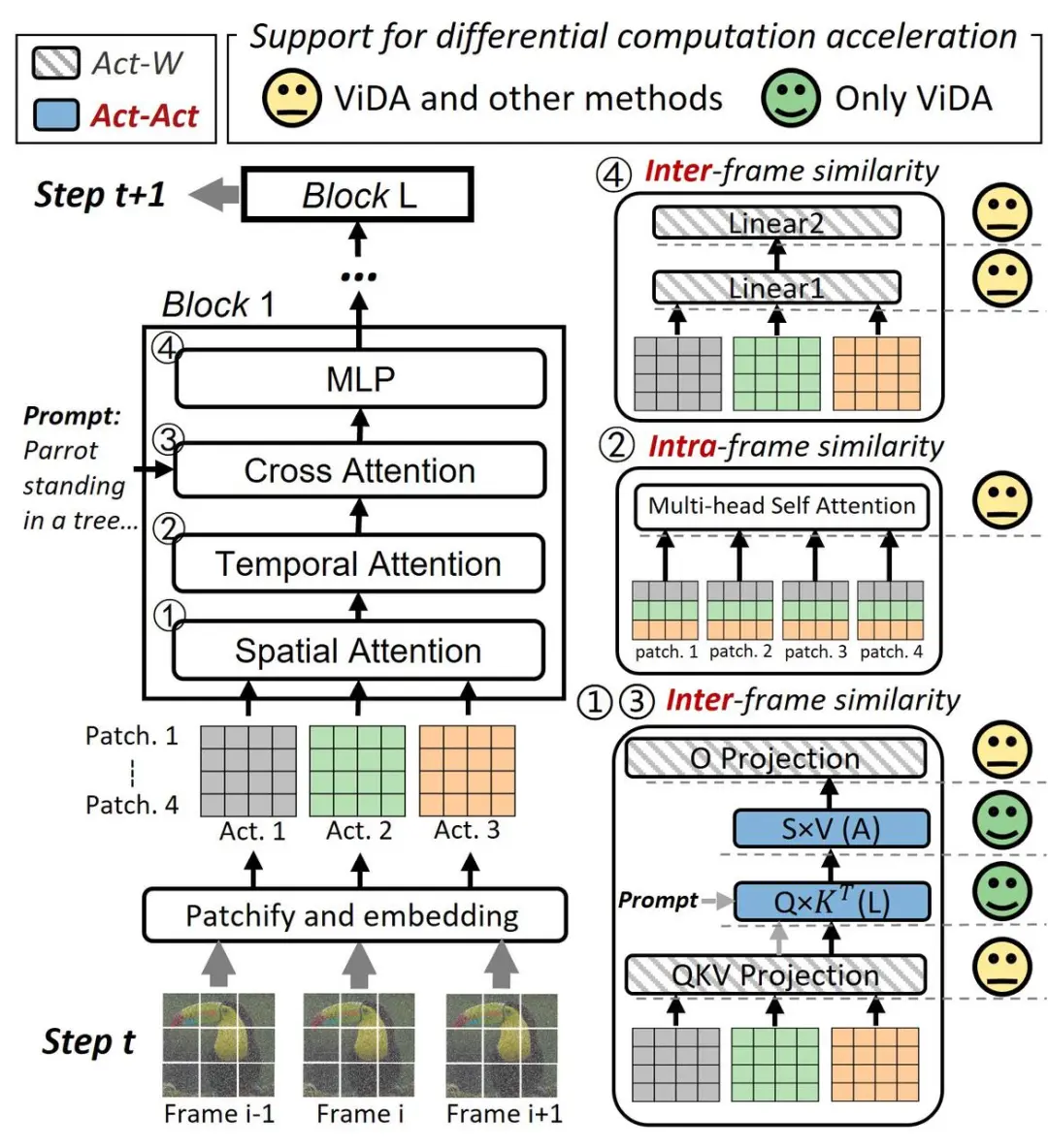 ViDA的设计深受传统视频处理中基于相似性去除帧间冗余方法的启发。如图1所示,在传统视频处理中,帧间的高相似性被充分利用,通过对相邻帧进行分块比较,将当前帧的内容表示为参考帧的基础上叠加变化信息,从而有效去除帧间的冗余。这种方法不仅减少了存储和传输中重复数据的占用,还能通过优化预测和补偿机制,大幅提高视频编码的效率。这种基于相似性的优化策略为传统视频处理提供了显著的存储与传输优势,同时也为生成模型的推理优化提供了重要参考。
