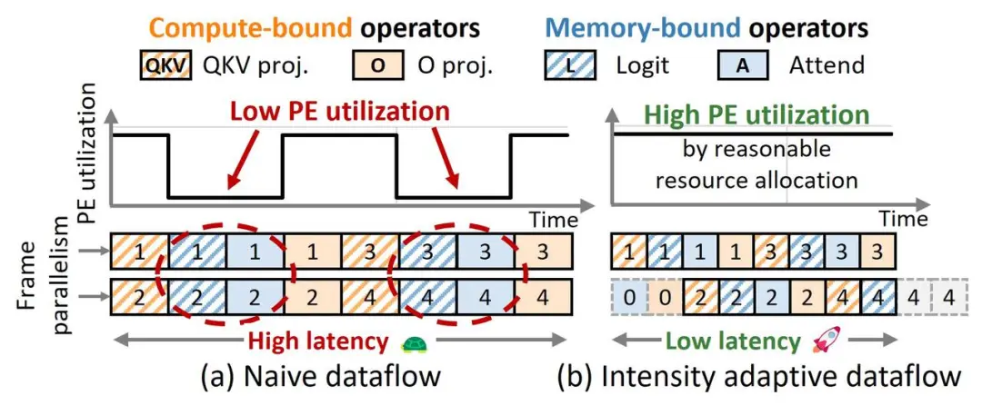 1. 资源平衡:针对注意力计算中计算强度差异大(如图7(a)),对Logit和Attend操作优化内存访问压力,对QKV和O投影操作优化计算密集度,提升处理单元(PE)和内存带宽的利用率。