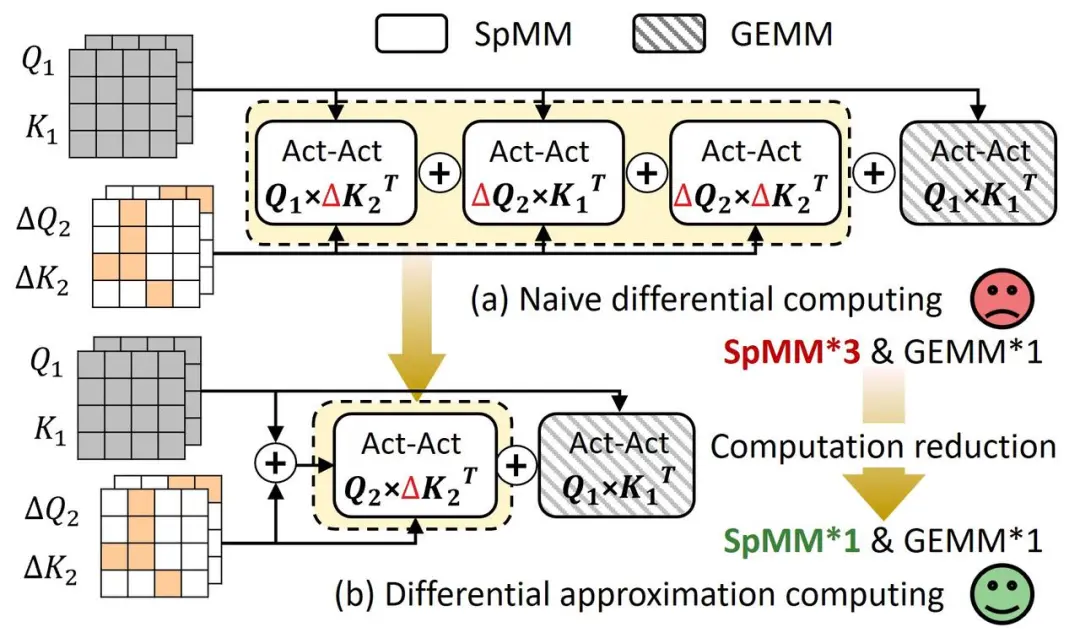 如图5(a)所示,我们选取一个特定的激活作为参考激活,对冗余激活执行差分剪枝操作后,冗余激活的Act-Act计算可以拆解为4个部分,需要进行三次稀疏矩阵-矩阵乘法(SpMM)计算,不能实现计算效率提升。