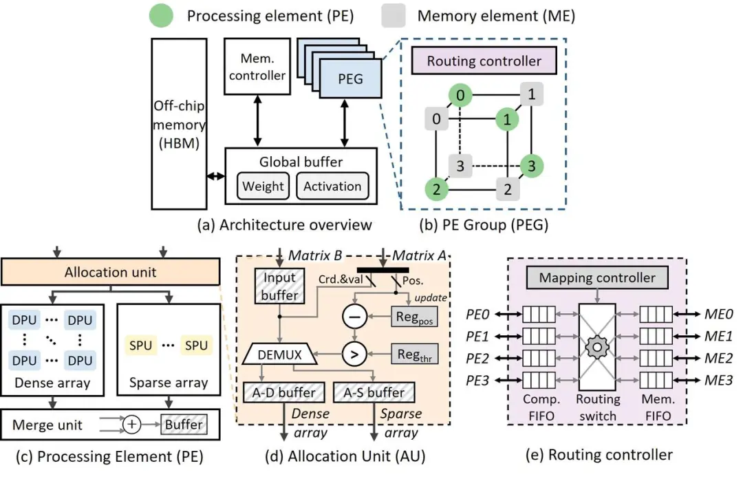 如图6(c)所示,稠密计算使用普通脉动阵列格式,稀疏计算则通过队列形式输入非零值,从而在稠密与稀疏计算之间实现硬件利用率的平衡。如图6(d)所示,对于CSC格式的稀疏激活,分配单元根据非零值比例动态分配列到稠密或稀疏数组执行计算,优化任务分配并提高硬件利用率。
