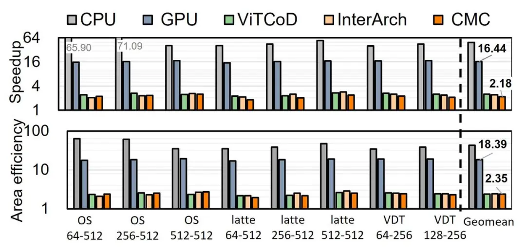 图 8:ViDA 与 CPU、GPU及SOTA加速器在三个 VDiT模型上的加速和面积效率比较